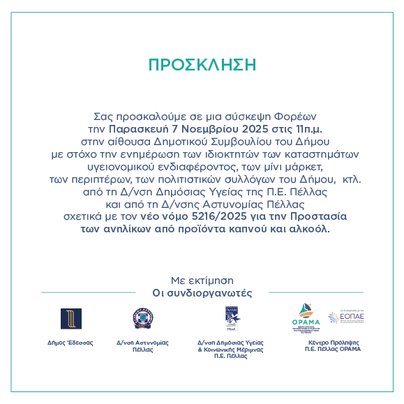 Την Παρασκευή 7 Νοεμβρίου 2025, στις 11:00 π.μ., θα πραγματοποιηθεί στην αίθουσα Δημοτικού Συμβουλίου του Δήμου Έδεσσας μια ευρεία σύσκεψη φορέων, με θέμα την ενημέρωση και ευαισθητοποίηση για την προστασία των ανηλίκων από προϊόντα καπνού και αλκοόλ.