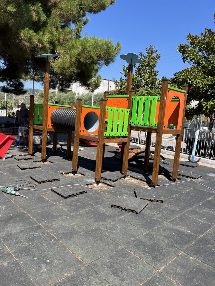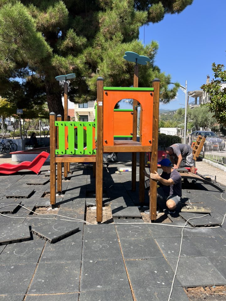 Ακόμη τις επόμενες ημέρες θα τοποθετηθούν και νέοι τάπητες ασφαλείας (όπου υπάρχουν φθορές)για να είναι πλήρως λειτουργική η παιδική χαρά.